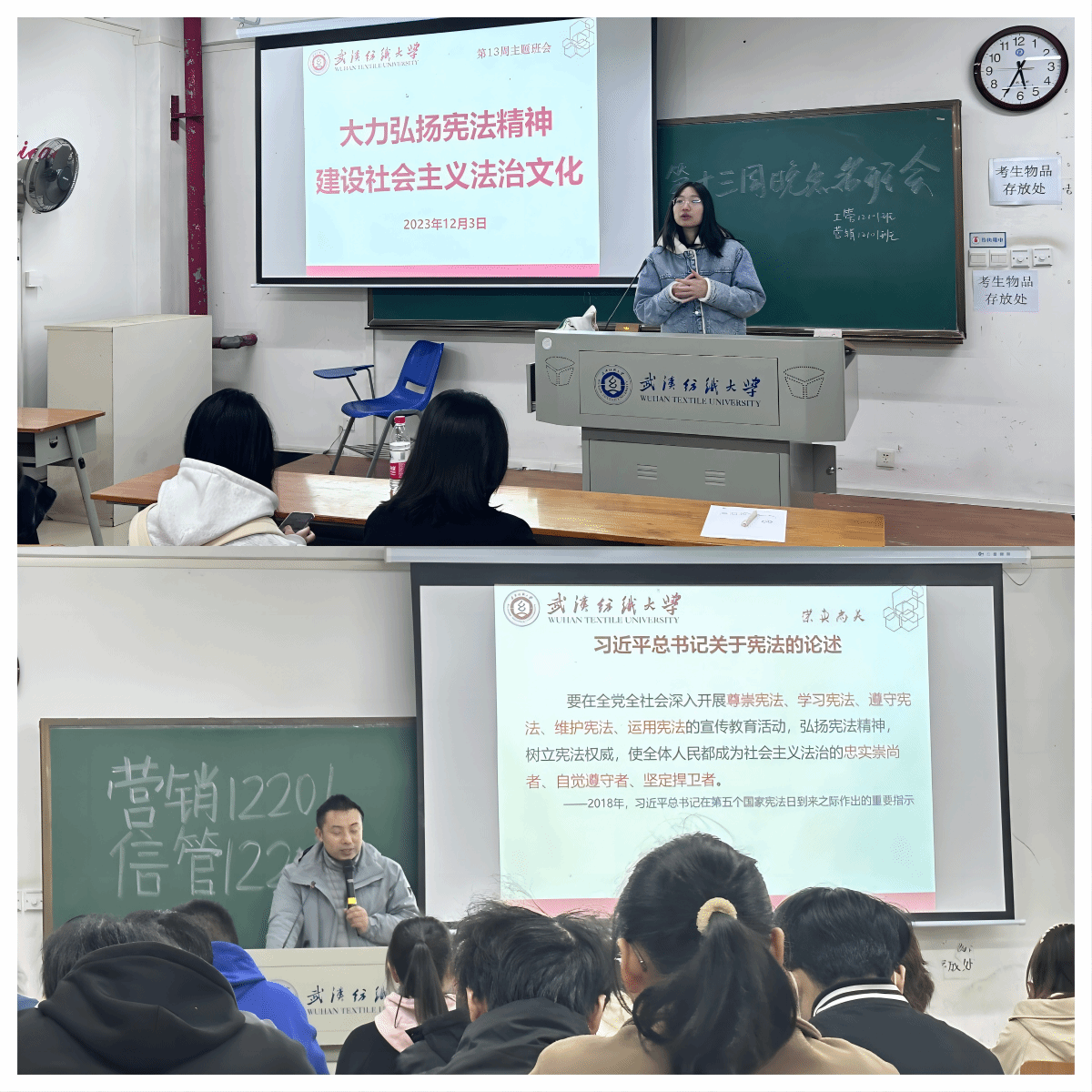 2023年12月1日至12月7日是我国第六个宪法宣传周,为大力弘扬宪法精神,强化大学生法治思维,增强宪法意识,12月3日下午,3522vip浦京集团官网开展“大力弘扬宪法精神 建设社会主义法治文化”主题教育班会,各班班主任和辅导员主持,全院所有班级学生参加。