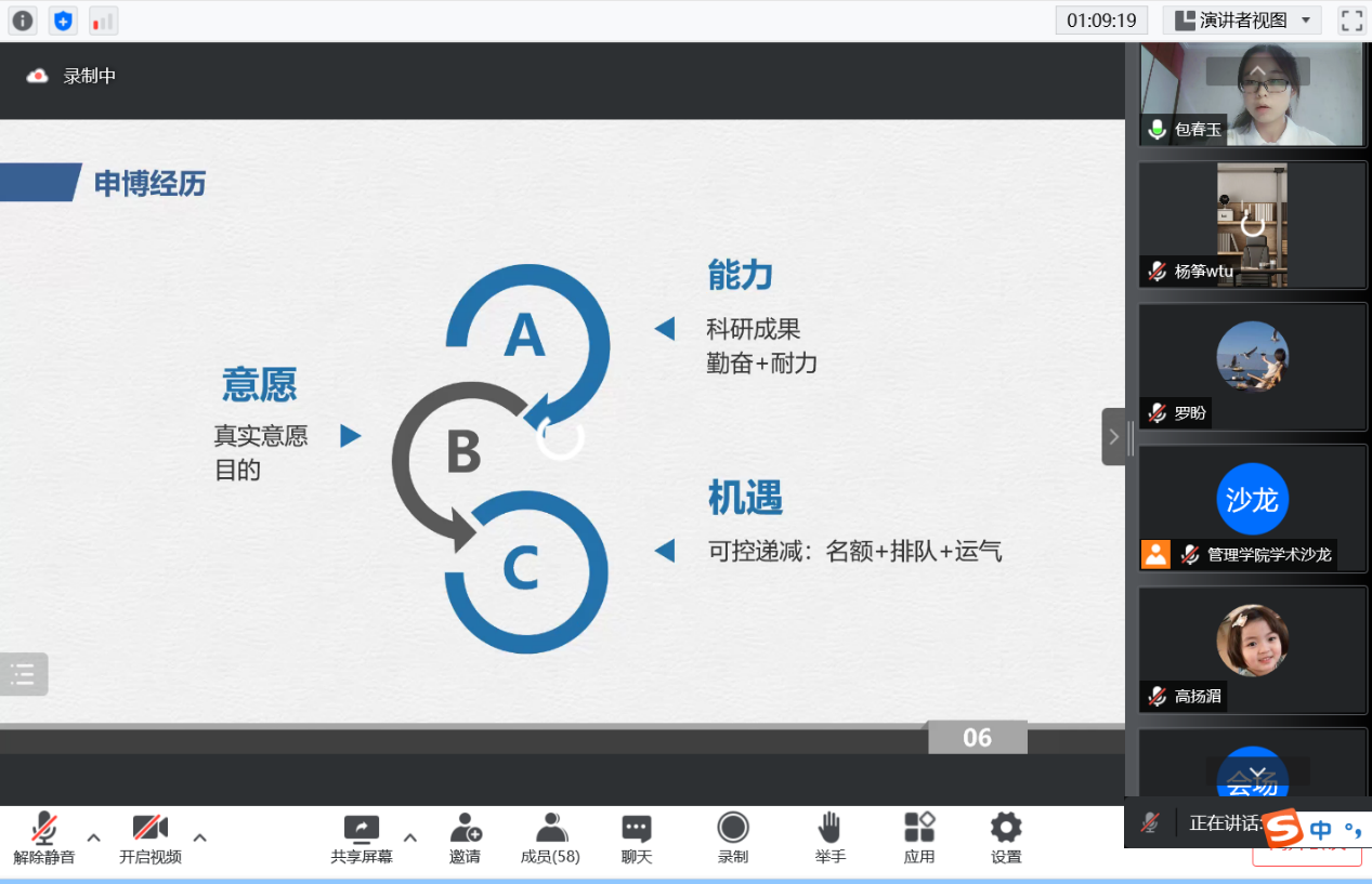 6月30日下午,我院在7-513以线上线下同时进行的方式举办考博经验分享会,旨在充分发挥研究生朋辈力量,激发我院研究生考博热情,明确考博目标,对考博有一个更全面更具体的规划。本次交流会邀请了我院成功考取南京大学博士的2021届优秀毕业生包春玉来分享考博心路历程。本次活动由学院杨筝博士主持,3522vip浦京集团官网部分教师及全体研究生积极参会。